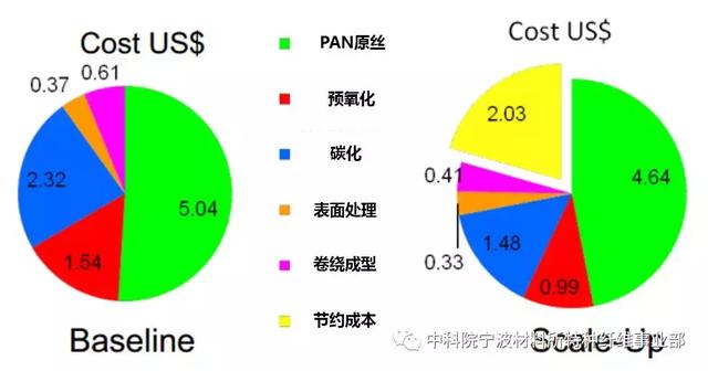 按照图6对比显示,通过规模放大就可以使原有碳纤维生产总成本9.88美元降低2.03美元,其降低幅度也算是相当可观,极具吸引力,尤其是对于碳纤维企业来说,既然从100吨升级到500吨、甚至上千吨,生产成本可以下降,那索性扩大规模吧。