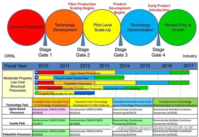 随后,ORNL更是制定了长期发展规划,低成本碳纤维研制共分五个阶段,第一阶段是概念提出,第二阶段是开发技术,第三阶段是实验室规模试制,第四阶段是技术验证,最后是技术成熟投放市场,具体路线如图4所示。